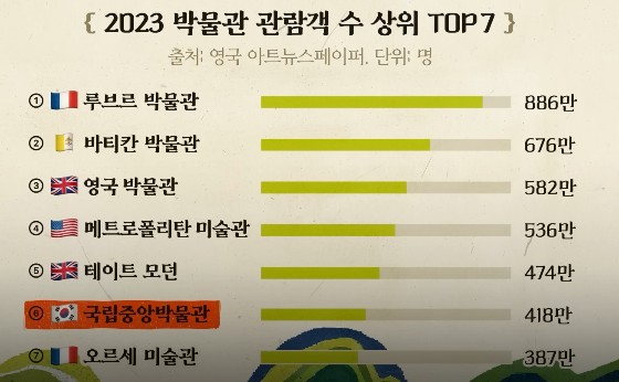 바로 국립중앙박물관입니다. 2023년 기준 무려 418만 명의 관람객이 다녀가며 세계 박물관 순위 6위, 아시아 1위를 차지했어요. 게다가 관람료는 무료라는 사실!