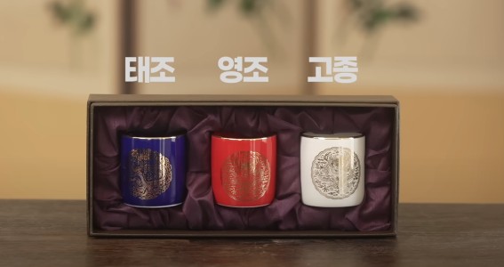 조선 왕들의 곤룡포 문양을 담은 도자기 잔 세트. 여주산 백자로 제작돼 고급스러운 선물용으로 딱입니다. 금박 디테일 덕분에 실제로 보면 훨씬 더 화려해요.