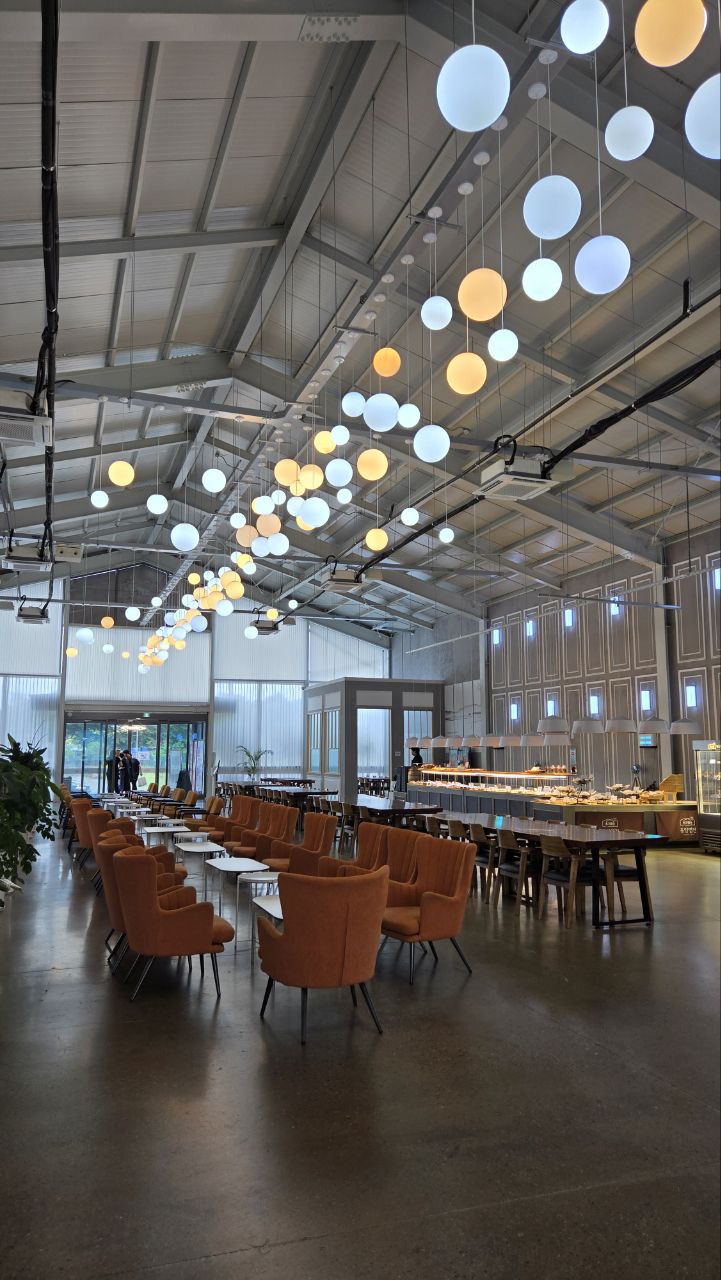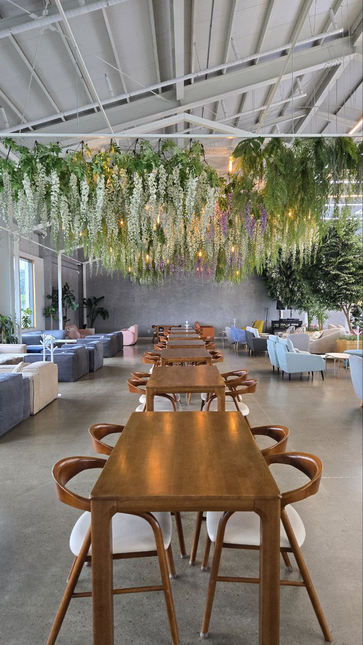 - 인테리어: 웨어하우스 감성 + 천장 높고 채광 좋은 대형 카페