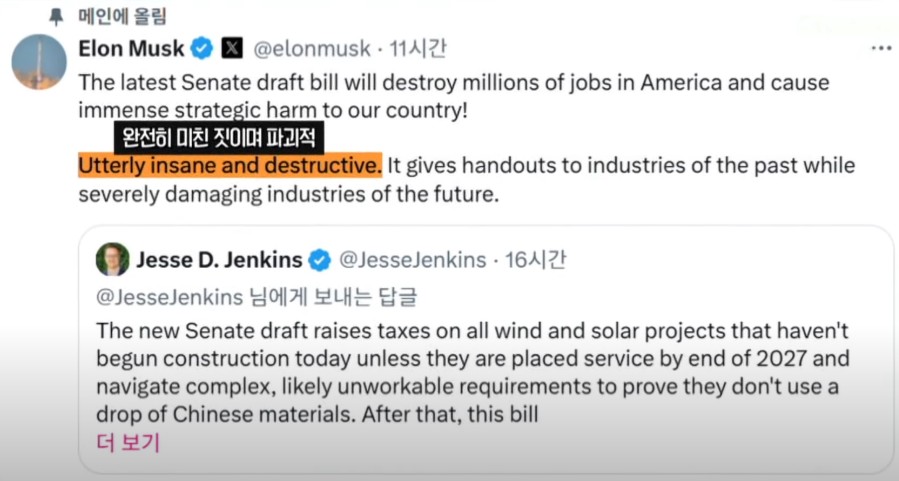 현지시간 6월 28일, 머스크는 X(구 트위터)에 트럼프의 감세 법안 초안을 공개 비판했습니다. 그는 이 법안을 "미국에서 수백만 개의 일자리를 파괴하고, 전략적으로 막대한 피해를 줄 것"이라고 주장했습니다. 더 나아가 "완전히 정신 나간 파괴적 정책"이라며 강한 표현도 서슴지 않았습니다.