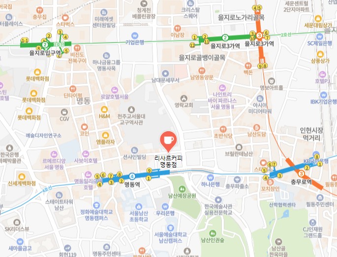 리사르커피 명동점은 명동역 10번 출구에서 도보로 몇 분 거리에 위치해 있어 접근성도 좋습니다.