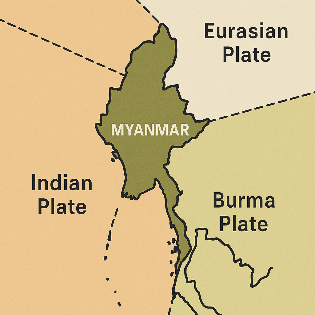 • 미얀마는 **인도판(Indian Plate)**과 유라시아판(Eurasian Plate), 그리고 **버마판(Burma Plate)**이 만나는 복잡한 경계 지역에 위치해 있습니다.