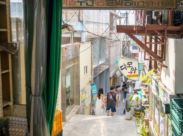 낡은 건물 아래 들어선 건 이제는 트렌디한 카페와 개성 넘치는 식당입니다. 빈티지한 골목 분위기와 현대적 감각이 어우러져 마치 유럽의 작은 마켓을 걷는 듯한 느낌을 줍니다.