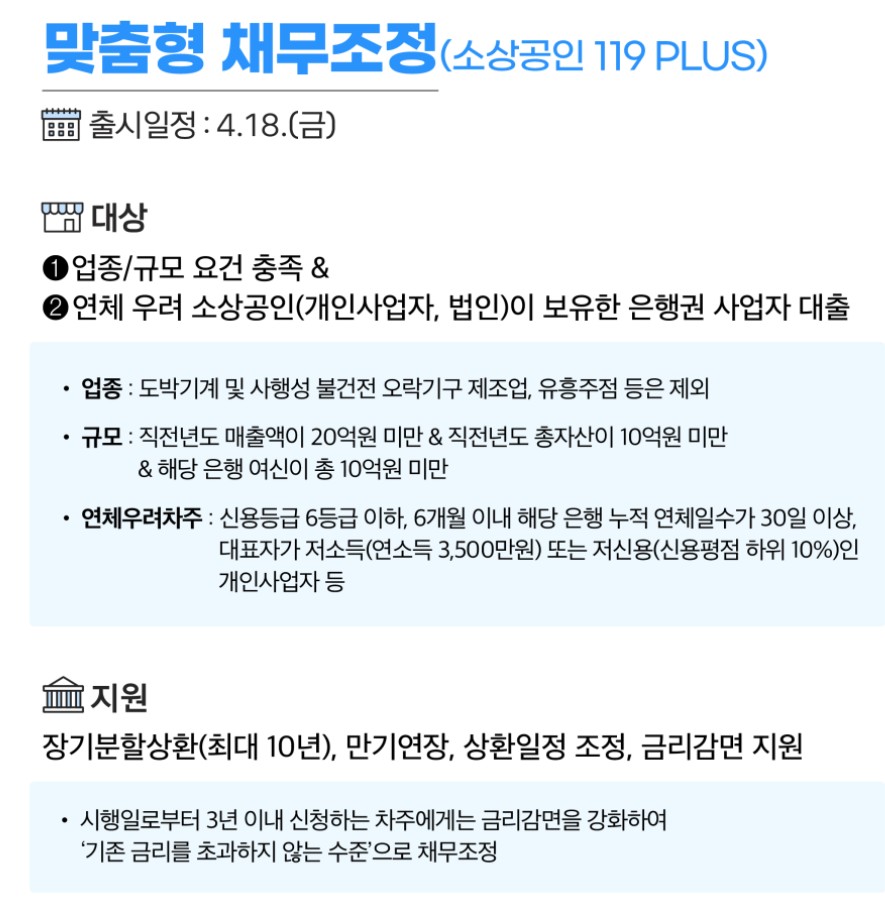 장기분할상환(최대10년),만기연장,상환일정 조정, 금리감면 지원