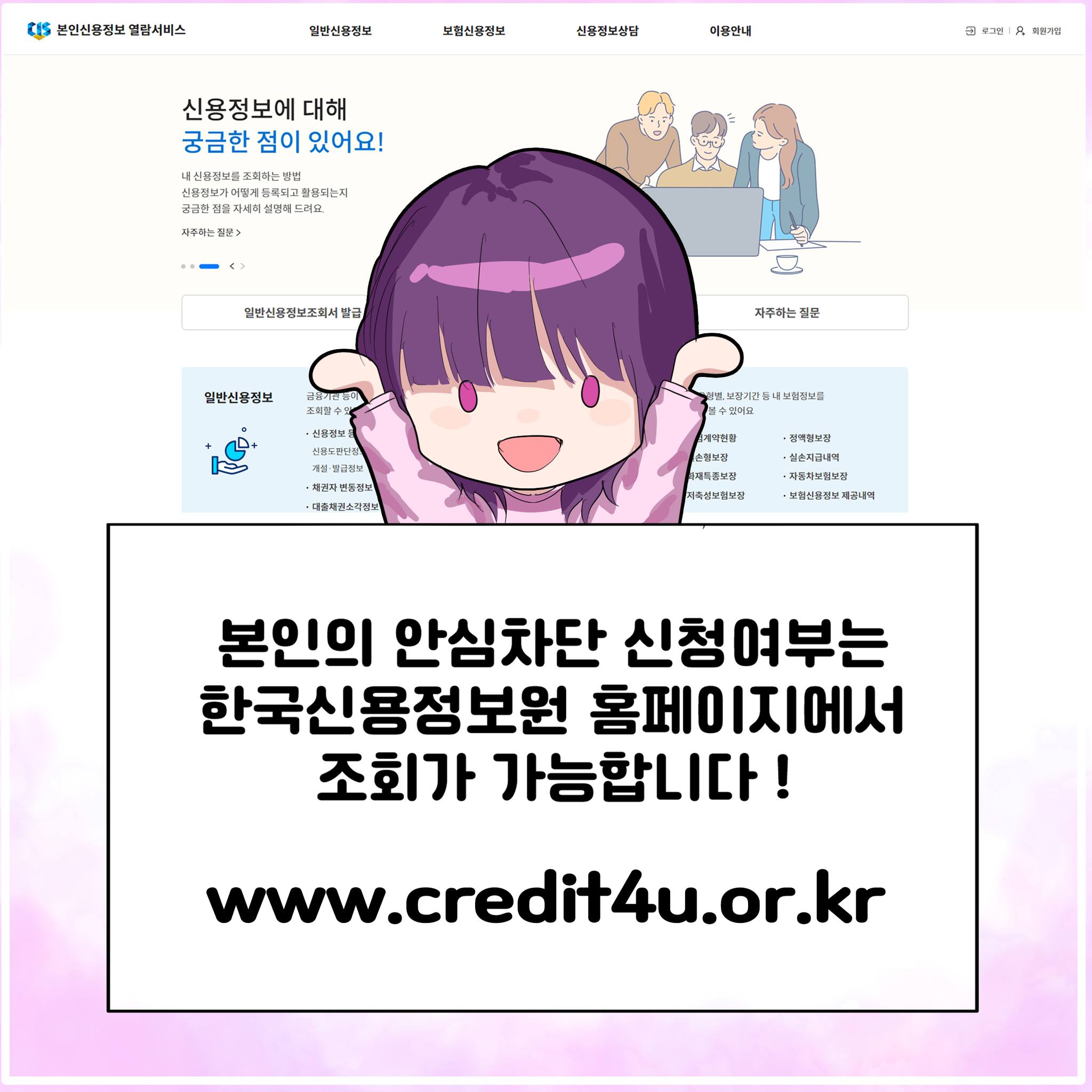 한국신용정보원 홈페이지에서 본인의 안심차단 신청 여부를 쉽게 조회할 수 있습니다.