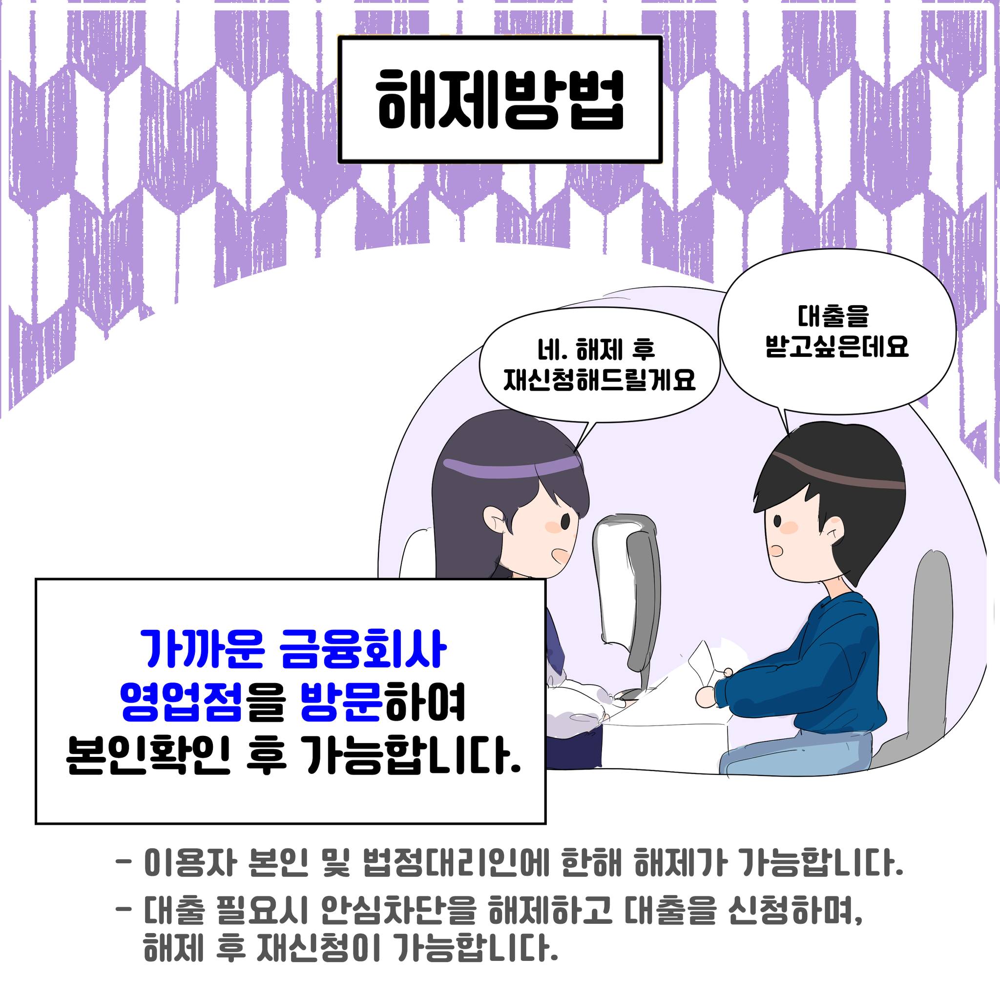 즉, 보이스피싱이나 명의 도용으로 인해 본인의 동의 없이 대출이 실행되는 일을 원천 차단할 수 있는 제도입니다.