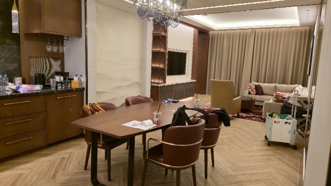 들어서자마자 보이는 넓은 거실 + 큰 테이블 + 미니바 조합에 감탄부터 나왔어요.