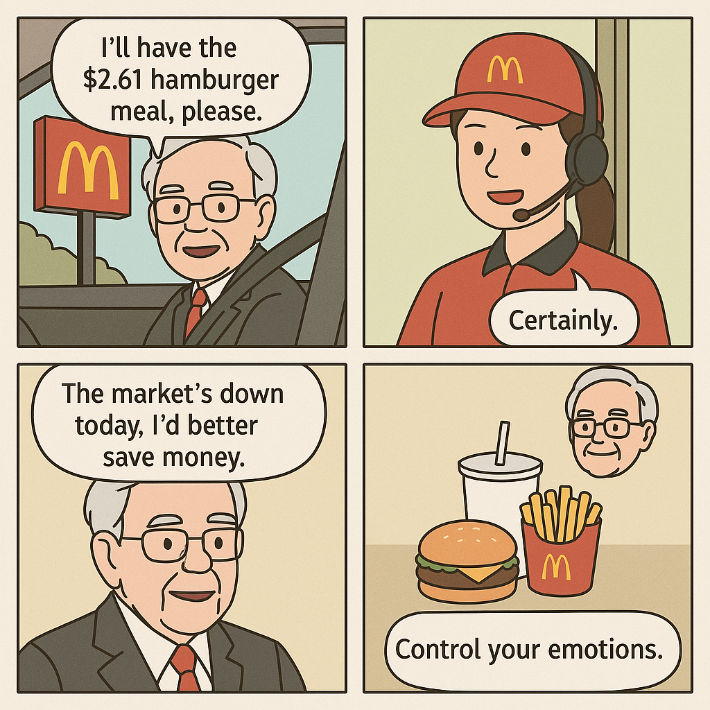 버핏은 매일 아침 맥도날드 드라이브 스루를 이용해 아침 식사를 해결하는 습관으로도 유명합니다. 주식 시장이 하락세이면, 그는 가장 저렴한 메뉴인 2.61달러짜리 햄버거 세트를 주문한다고 합니다. 그 이유는 간단합니다.