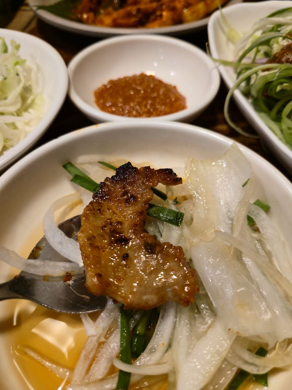 양념된 고추장 삼겹살은 불판 위에서 금세 익어가며 고소한 향을 뿜어냈고, 달콤한 양파와 함께 먹으니 감칠맛이 두 배였습니다. 겉은 바삭하고 속은 촉촉해서 그냥 구워 먹는 것도 맛있지만, 살짝 태우듯 구우면 더 맛있어요. 정말 오래간만에 맛있는 고추장 삼겹살을 먹어서 추가로 1인분을 더 주문했을 정도랍니다.