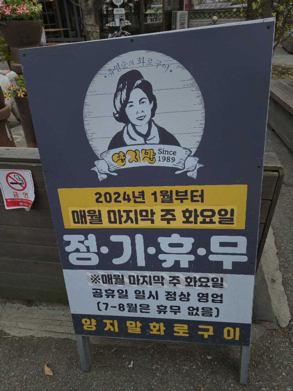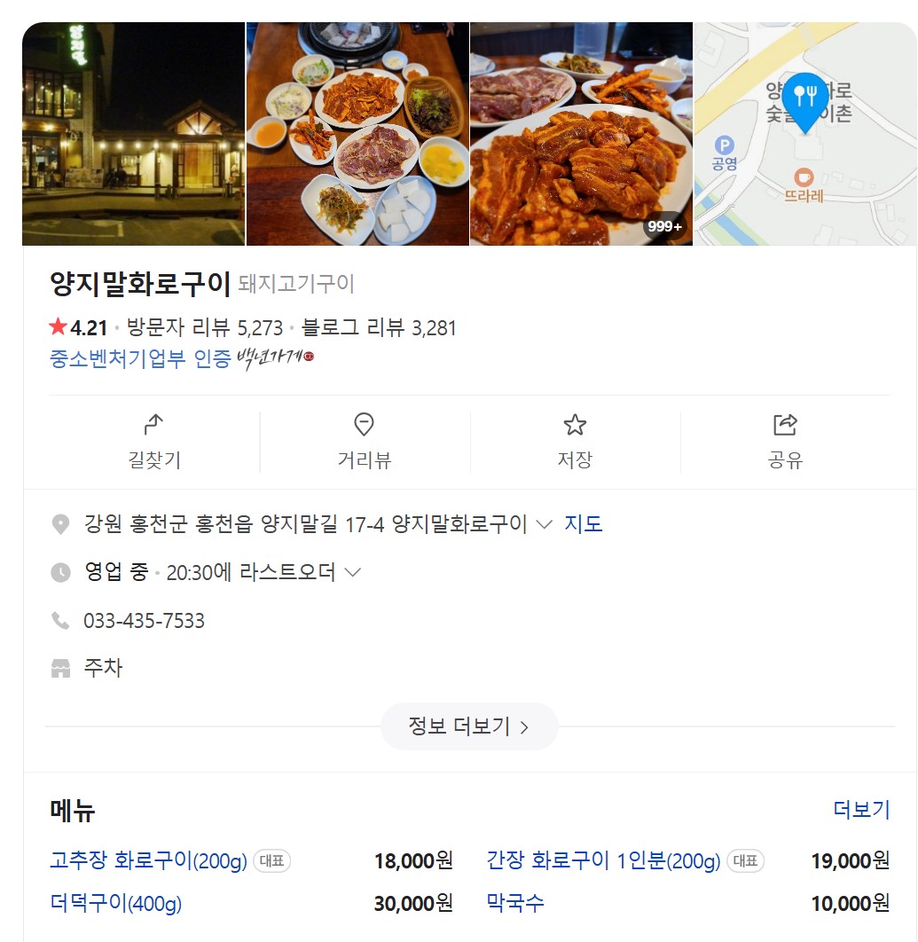 주말에 비발디파크를 다녀오면서 근처 홍천 맛집을 검색하다가 ‘양지말화로구이’를 방문하게 되었어요.