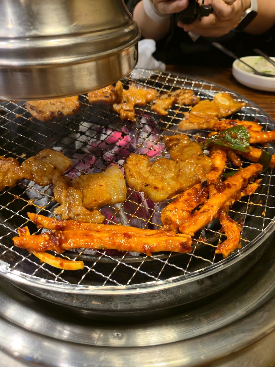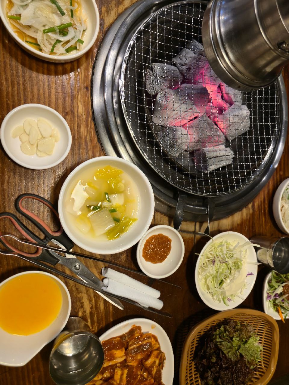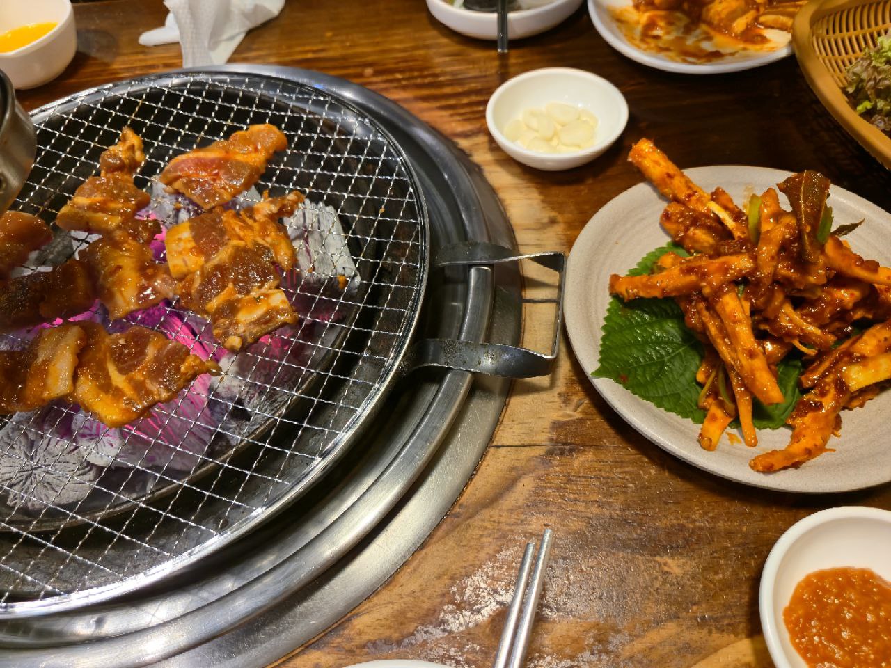 대기가 많은 곳으로 유명하여 입장부터 걱정했지만 운좋게 바로 자리를 안내받아 들어갈 수 있었고, 앉자마자 가장 유명하다는 고추장 삼겹살과 더덕구이를 주문했어요. 연탄불과 함께 셋팅된 반찬들도 정갈하게 준비되어 있었고, 특히 샐러드와 단호박죽이 인상 깊었습니다.