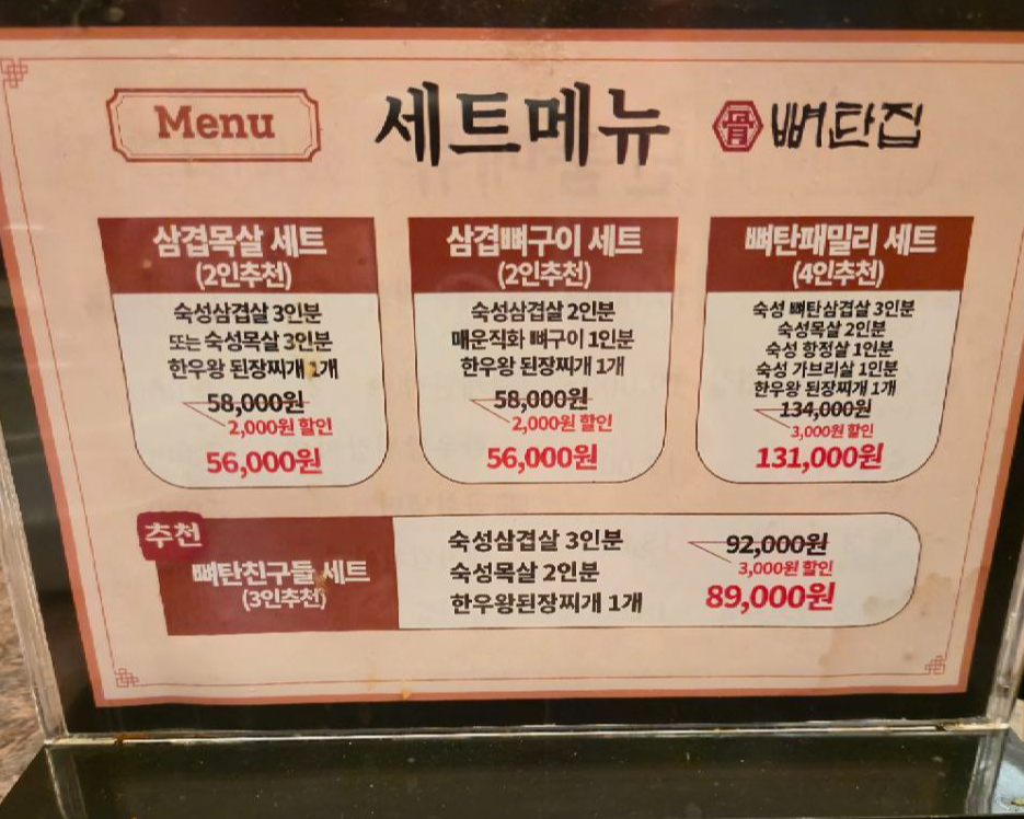 추천 메뉴: 삼겹뼈구이 세트, 계탄밥, 한우된장찌개