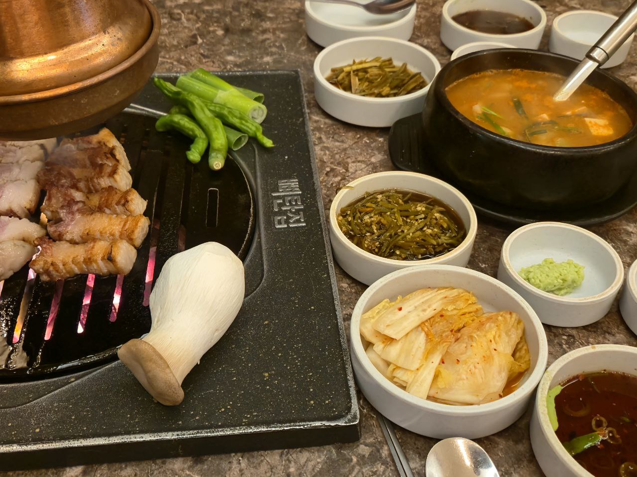 입장하자마자 삼겹뼈구이 세트를 주문! 기본 찬들도 정갈하게 세팅되었고,