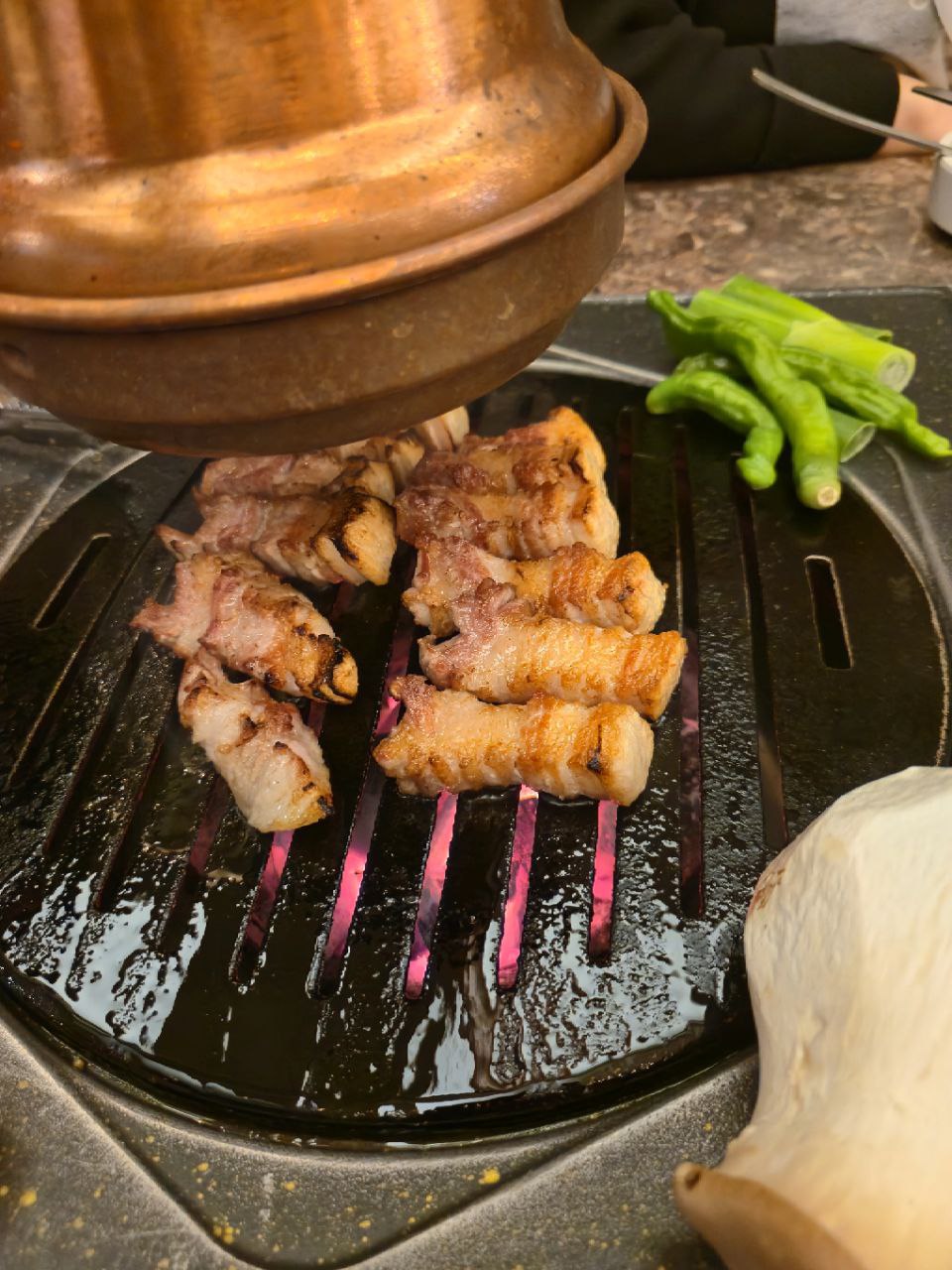 노릇노릇 익은 삼겹살에 김치, 고추, 소금까지 곁들이면… 진짜 말잇못!